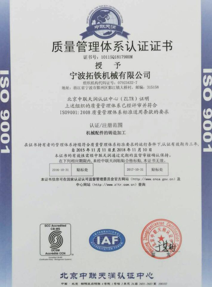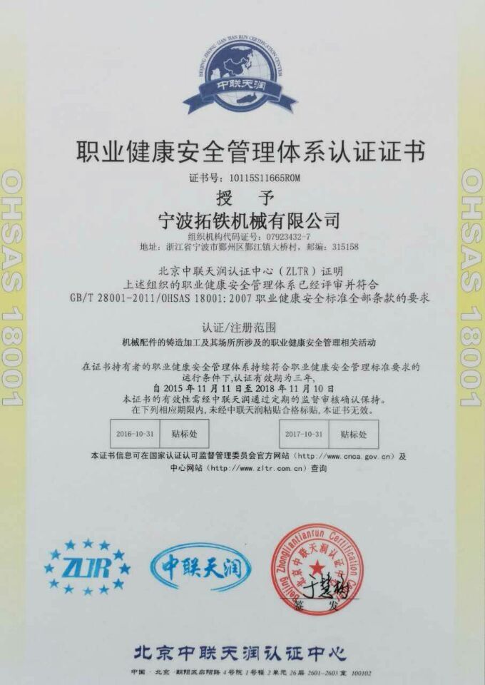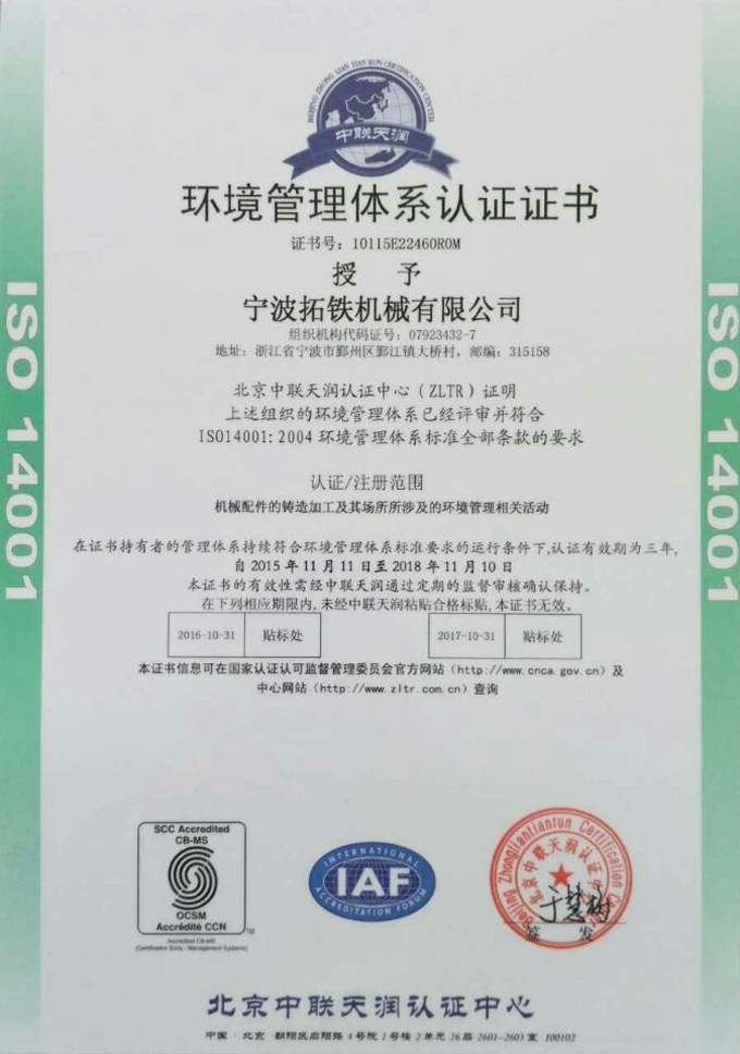 2015年11月,8868(中国)8868官方网站机械获得国家ISO9001质量管理体系认证,ISO14001环境管理体系认证和OHSAS18001职业健康安全管理体系认证。